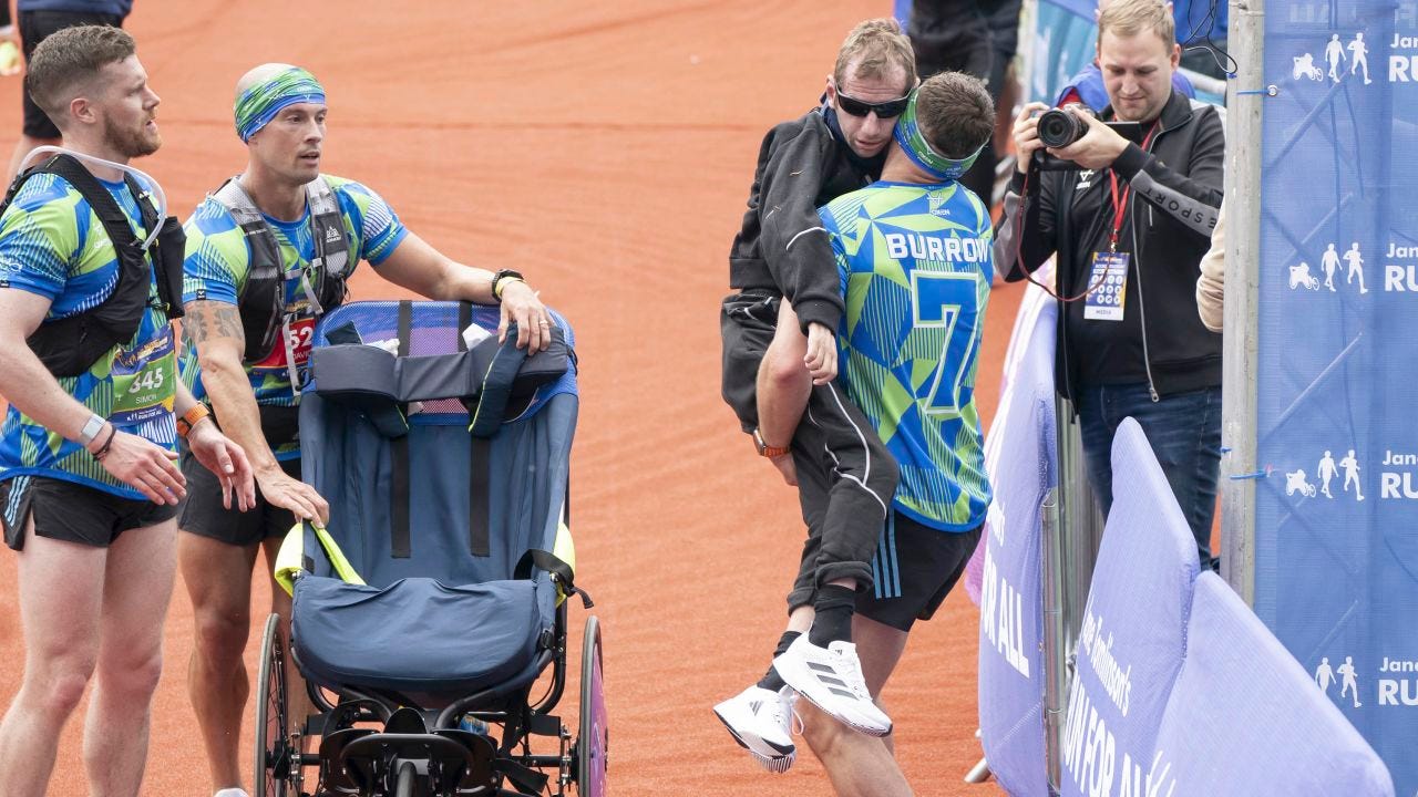 It’s an image that encapsulates the power of friendship through adversity: Kevin Sinfield, a legendary figure in the sport of rugby league, stops short of the finish line of a marathon to gather Rob Burrow, his friend and former teammate, into his arms.