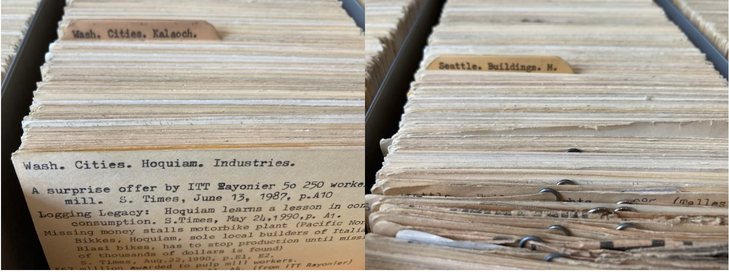 To the Seattle Public Library, particularly the Central Branch, with its deep accumulation of historic documents and its ancient, subject-based card catalog. Back in the day before digitized everything took over, librarians assembled a card catalog that referenced the history of Seattle. You could (and still can!) look up practically anything and find a newspaper or magazine citation, often with the article folded tightly and taped to the back of the card. Such a glorious thing.
