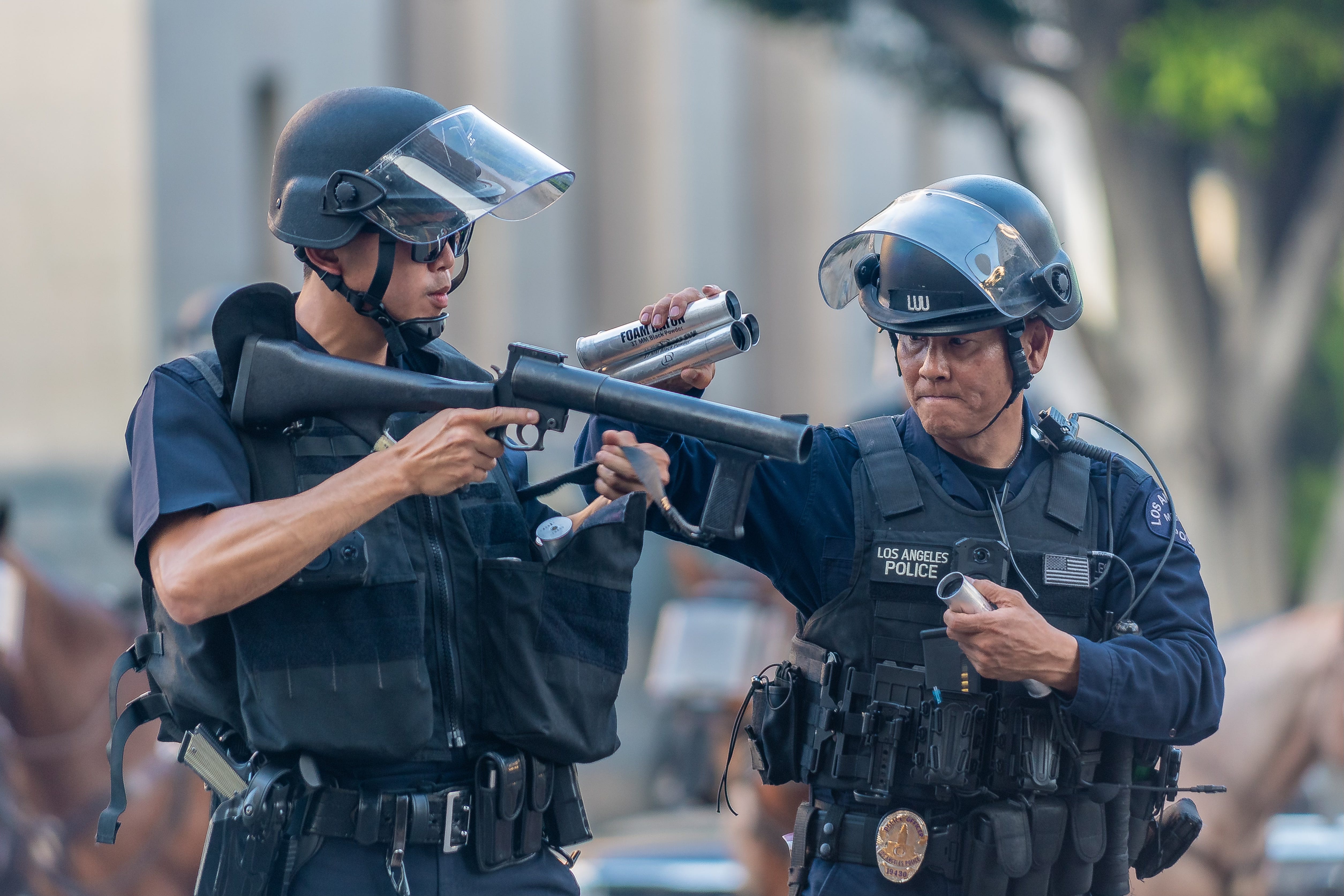 LAPD officers reloading tear gas launchers during a demonstration in downtown Los Angeles against expanded ICE operations on June 8, 2025.