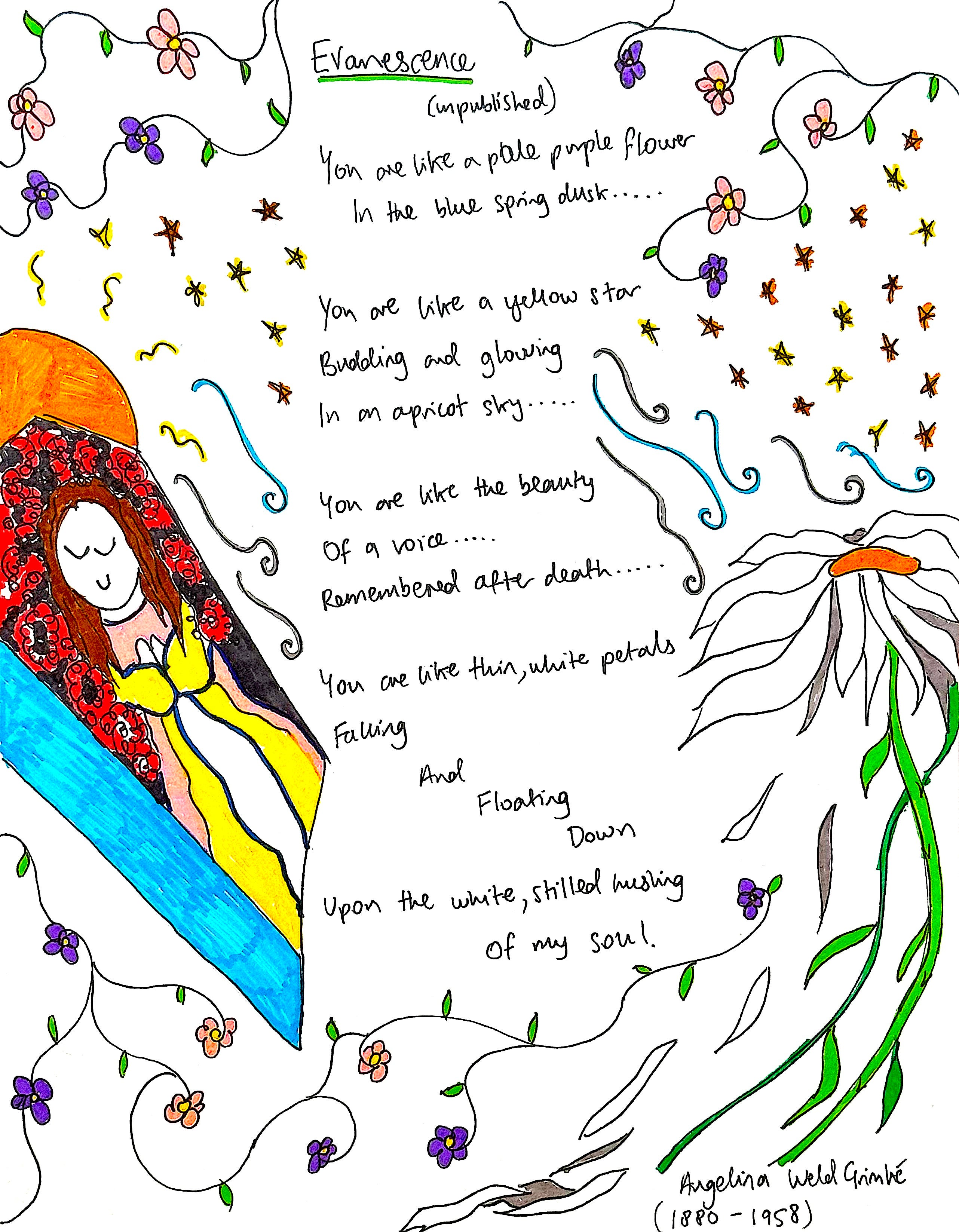 I first heard of Angelina Weld Grimké while researching for The Intimacy Journal on poets.org. I discovered that she was a journalist, teacher, playwright, and poet, and an influential figure in the Harlem Renaissance, but much of Grimké’s intimate poetry remained unpublished during her lifetime. Why? Well, works like this week’s featured poem from the 1920s, “Evanescence,” were about same-sex relationships. This was culturally forbidden at the time. I ended up featuring two of her poems in The Intimacy Journal, because it was impossible to pick just one!
