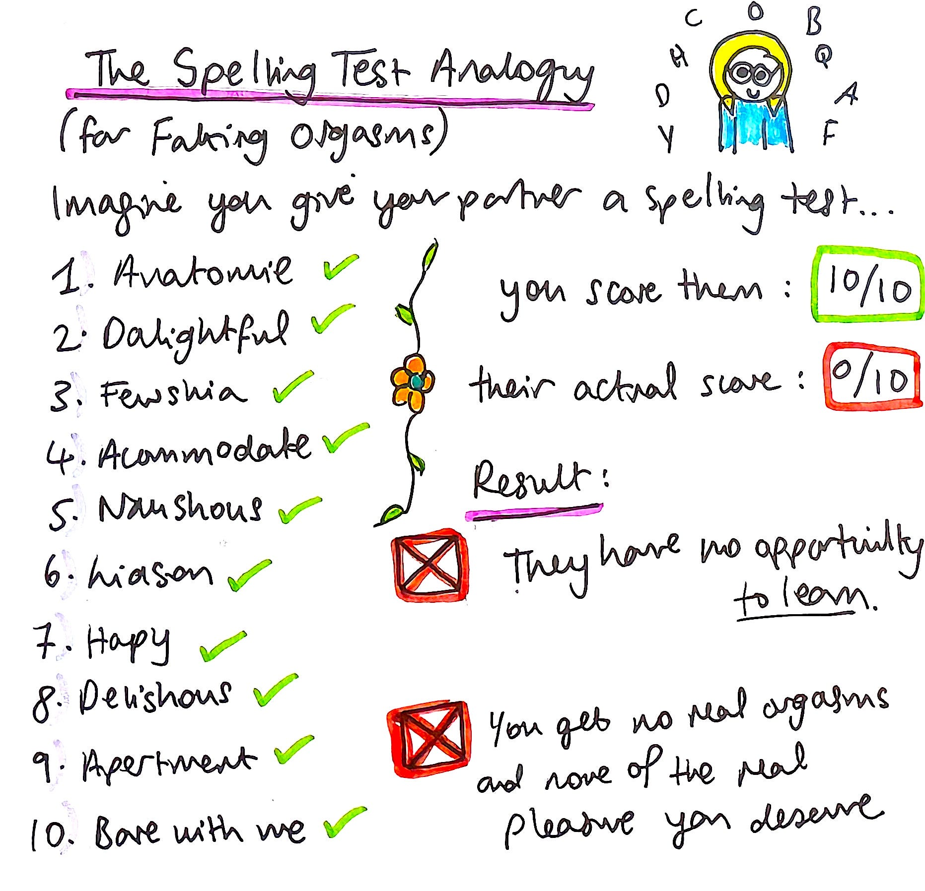 As far as Iâm concerned, faking an orgasm is a form of lying, and it is a sexual sin. I liken it to âThe Spelling Test Analogy.â Imagine you give your partner a spelling test. If they get 10/10 correct on this spelling test, you get 5 of the most earth-shattering orgasms youâve ever had in your life. You read out each word, and this is how he spells them: