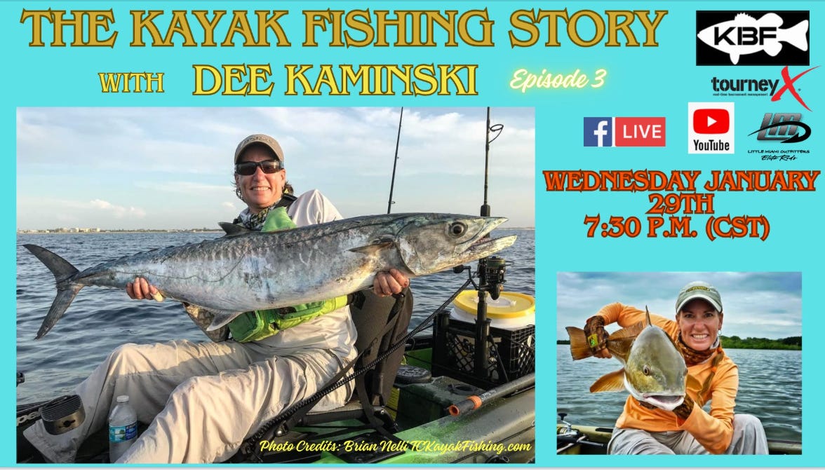 This week Kayakjak and Co-Host Trey Dawson will have Dee Kaminski a renowned kayak fishing guide who runs Reel Kayak Fishing Charters of Florida. Thanks to our sponsors who support this effort to tell the story. Kayak Bass Fishing, TourneyX, and Little Miami Outfitters.