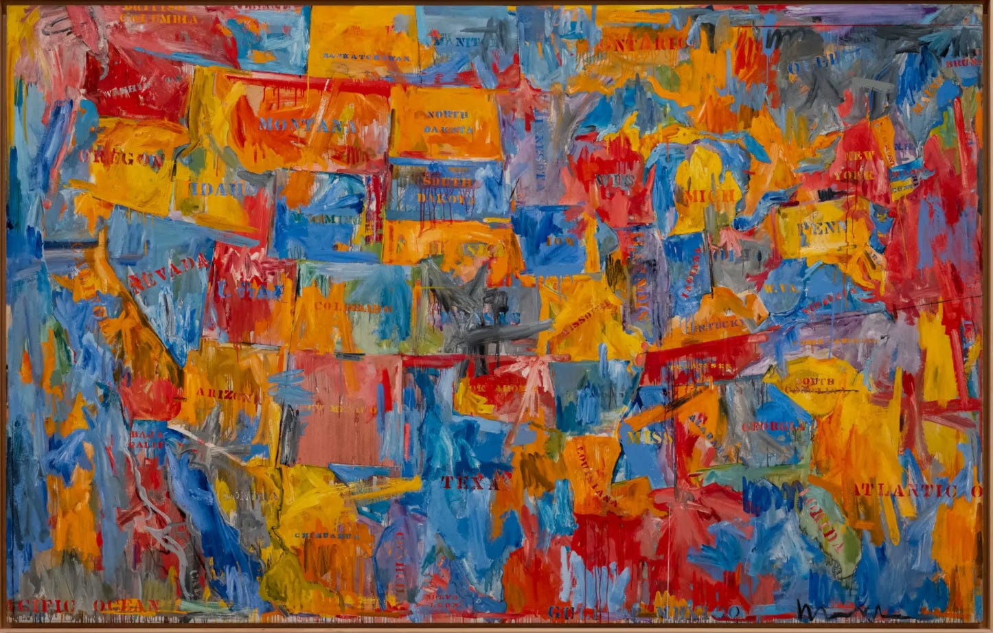 So much work and I’ve barely scratched the surface of what John's scholars know and think and understand, and then I remember why I love the flag paintings, and never even thought to study them. My viseral response to Map reminds me of grade school, family road trips from Illinois to Florida, that Michigan looks like a mitten, and Oklahoma like a gun. My just-looking and not-thinking-so-much reaction is to the direct color--cadmium red and yellow and cobalt blue, of course mixed and finessed, but still very direct hues that feel honest and unadulterated. My eye hangs on wild California, looking part land and part sea, drippy Louisiana, eradicated South Carolina, hard to find New Hampshire, Vermont, and Maine. What is going on in Kansas, grey with an action-packed stroke of charcoal, like a nuclear explosion somewhere near Salina? Some states are called by nicknames, like Penn and Mich and Wis and Miss, others formally acknowledged with surnames and all--North Dakota, South Dakota, New York. Neighboring places--British Columbia, Saskatchewan, Ontario, Baja Calif, Chihuahua, Gulf of Mexico, Atlantic Ocean--are part of the mass, same colors, shapes naming places, not like the puzzle I did as a kid in which the surrounding land and sea was fixed and only the tiny states were pieced for insertion. And there you have it, when my mind relaxes, I can actually admit to you that I love Johns’s flag paintings because they remind me of the puzzles I played with as a child, the ones that snuck Alaska and Hawaii in the lower left corner, just under California.