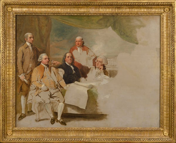 This week peace treaties that are never really finished, a group of men who didn’t like one another, and Benjamin West’s accurate non-finito portrayal of a treaty that was done before it even began. Westward Ho!