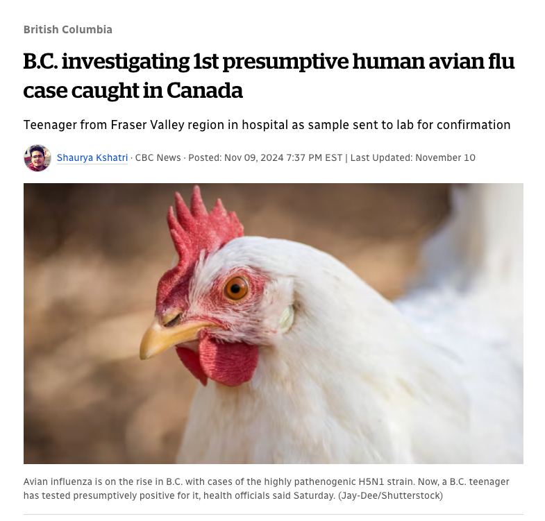 And while we’re here, it is worth noting that Canada has officially confirmed the first human case of H5 avian flu in British Columbia on Nov 9, 2024. Note the use of the words “presumptive”, “case” and “tested positive”. None of these suggests that the person is symptomatic, infectious or contagious. This will be a running theme moving forward (asymptomatic covid anyone?)