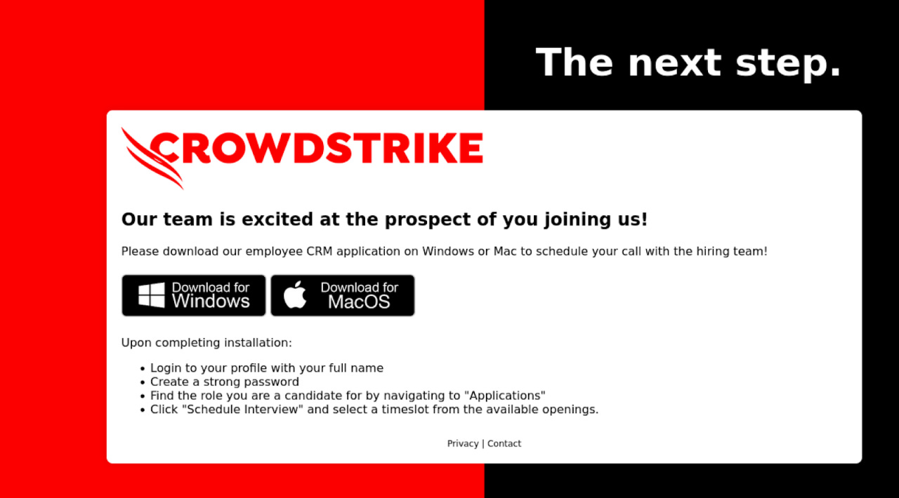 * Fake CRM Application: The website prompts the victim to download a "customer relationship management (CRM)" application to schedule the interview. However, this application is actually malware.