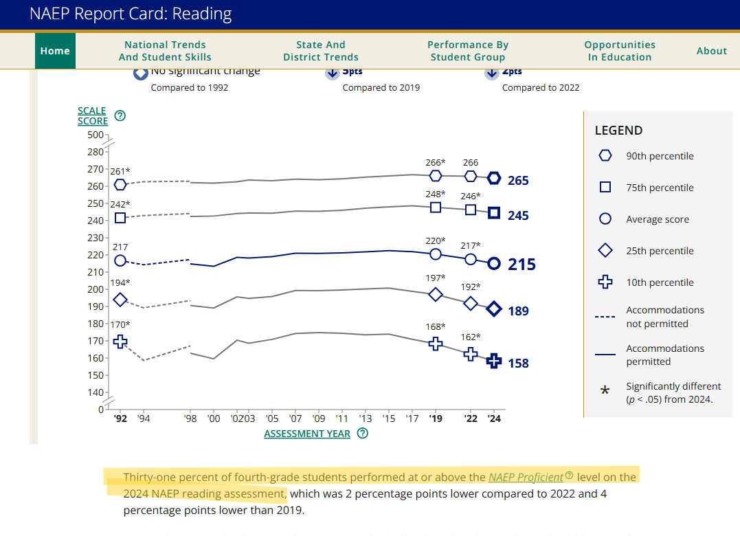 * The report only gets worse when it comes to reading. Only 31% percent of fourth-grade students performed at or above the proficient level on the 2024 National Assessment of Educational Progress (NAEP)] reading assessment > SOURCE