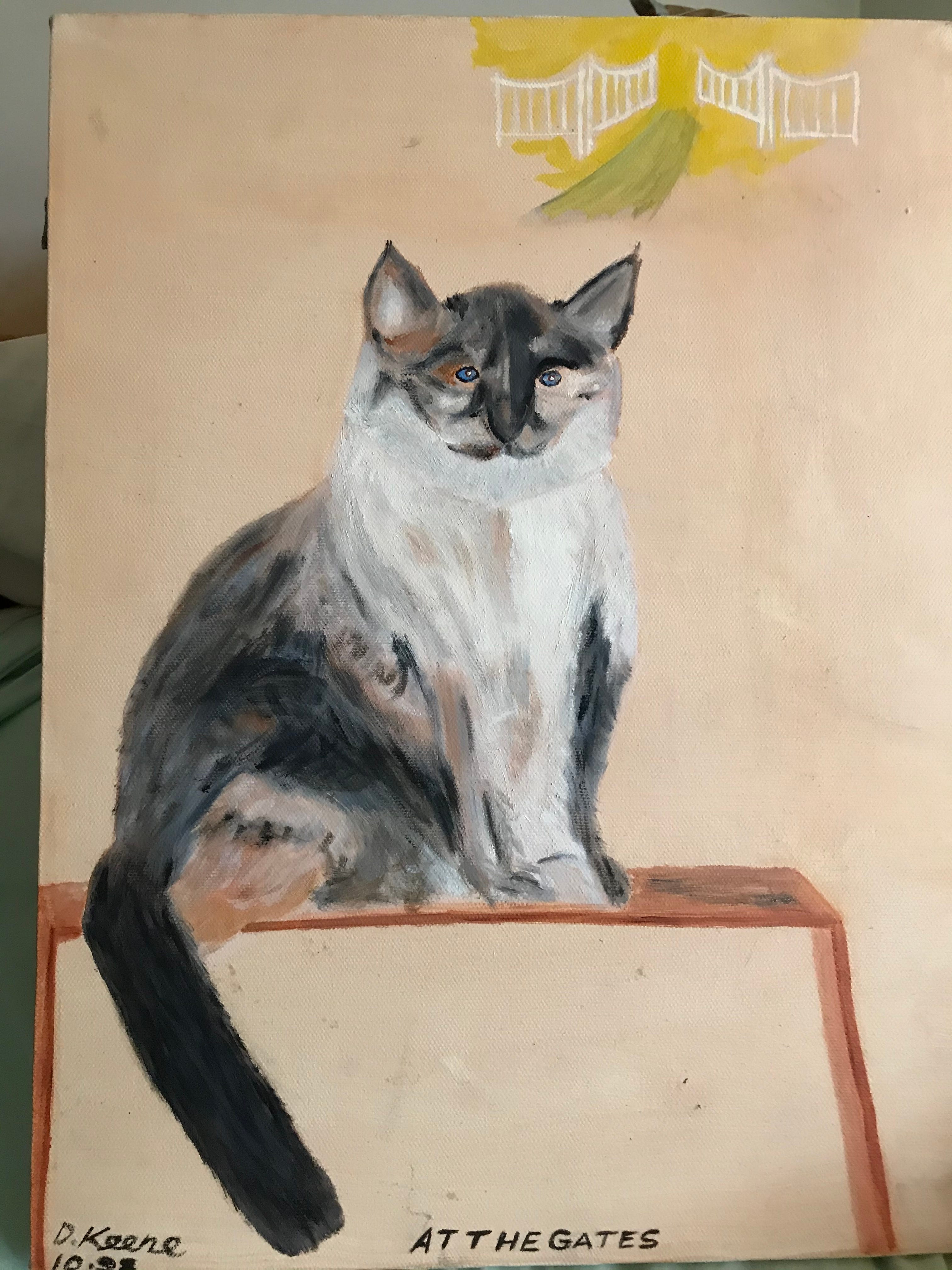 This is the first painting that my dad gave me. It’s of my cat, her name was Pearly, hence the Pearly Gates in the background. This does not resemble my cat in the least. She didn’t have a beard and actually her face looks a bit like my dad’s!