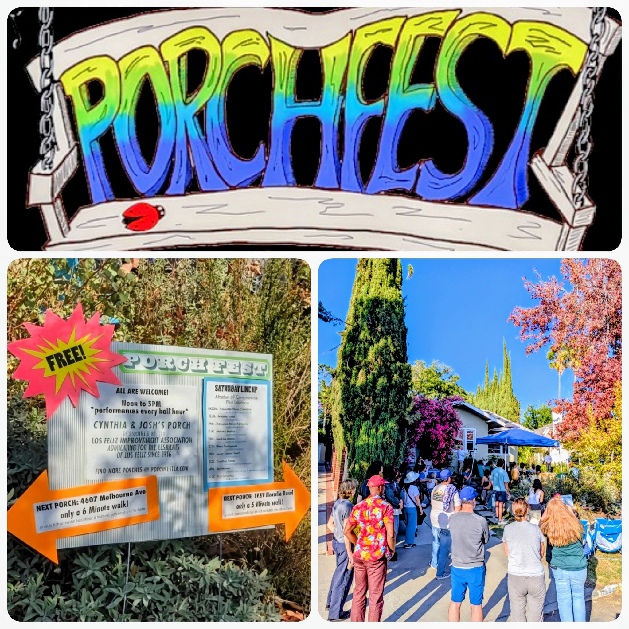 The Los Feliz Improvement Association has been working for more than a century to build a better Los Feliz. One of the ways they did this in 2025 was by sponsoring a porch as part of Porchfest L.A., which took place the first weekend in November. Originally held in Ithaca, New York, in 2007, Porchfest music festivals began as a way for community members to put the spotlight on local musicians by providing porches where they could perform. Longtime Los Feliz resident Hélène Udy brought Porchfest to Los Angeles in 2024, after spending years turning her own porch into a local landmark through the long-running cabaret show “Was Ist Das?” This year, under Hélène’s guidance, the second annual Porchfest L.A. featured performers appearing in front yards and parking lots, coffee houses and businesses throughout Los Feliz, Silver Lake, East Hollywood and even Culver City and Mar Vista. Those audience members who trekked from locale to locale were no doubt rewarded with a veritable moveable feast of a variety show, wherein they were treated to not only musical acts, but comedy, mentalism, clowning, poetry, and perhaps, even more!