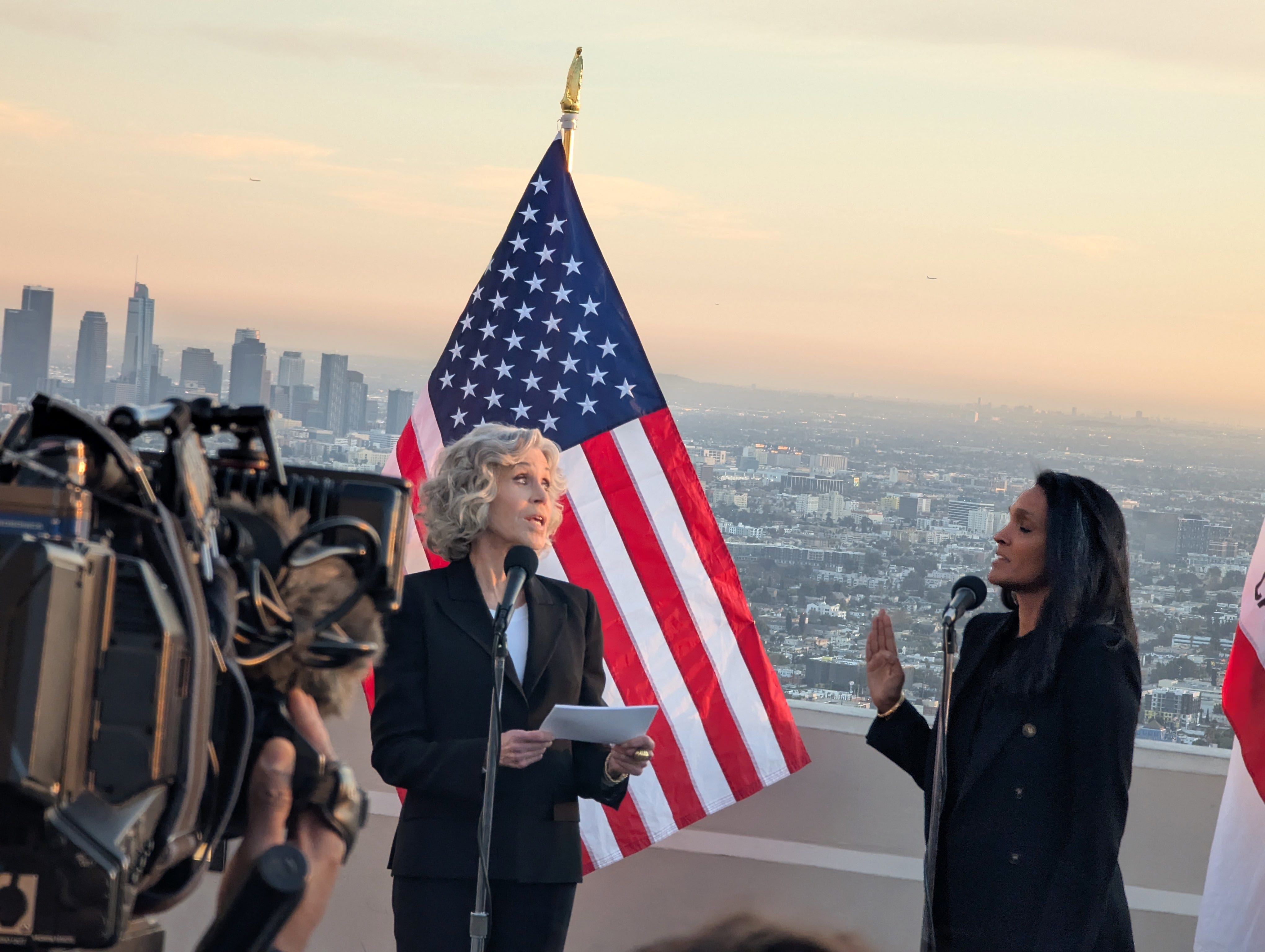 The following night was my last in Los Angeles for 2024. I spent a bulk of the evening at the Griffith Observatory, where I had been invited to attend Nithya Raman’s swearing in ceremony for her second term as the District 4 Representative to the Los Angeles City Council. The event began at 4 pm on the observatory terrace. I got all gussied up and took advantage of the free DASH bus that heads up to the observatory every fifteen minutes from Vermont Avenue. I was concerned that I might be late, but my timing could not have been more perfect as I walked in at the same time as Nithya and her family. The setting, which, of course, would be extraordinary under any conditions, was at its most magnificent, with the views of the Hollywood sign, the ocean, and downtown, all absolutely open for business. A high school jazz band and light refreshment welcomed us. A short while later, atop the elevated terrace, a high school girls’ choir delighted and amazed those in attendance with specially chosen gospel-flavored selections, including one particularly spirited rendition of Sam Cooke’s “A Change is Gonna Come”. After a few opening welcome remarks and acknowledgements, everyone in attendance snapped to attention with the astonishing announcement, “And now, Jane Fonda …”
