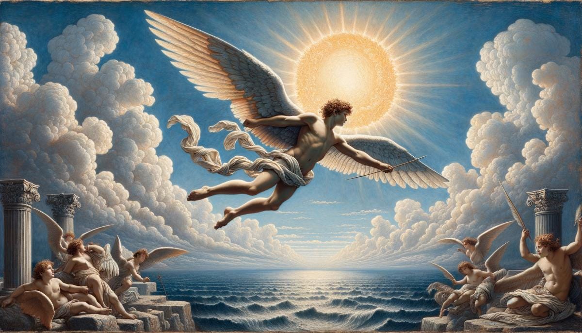 Dédalo e Ícaro, equipados com suas asas, lançaram-se ao céu e iniciaram a fuga da prisão de Creta. Por um tempo, tudo parecia perfeito. Eles conseguiam voar livres sobre o mar Egeu, com o vento nas costas e a liberdade à vista. No entanto, enquanto Dédalo mantinha o curso estável, Ícaro começou a sentir uma euforia crescente. A sensação de voar, algo que nenhum mortal havia experimentado, o tomou de forma avassaladora.
