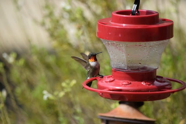 Female ruby-throated hummingbird at our feeder