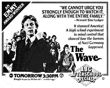 More interestingly, I pulled up a Wikipedia page on the ABC After School Specials and found a crapload of stuff about “The Wave,” which was based on a real-life demonstration (I don’t know that it was ever replicated, like the more famous Blue Eyes / Brown Eyes experiment has been). The original Special is there, a later documentary, lesson plans. Fascinating stuff.
