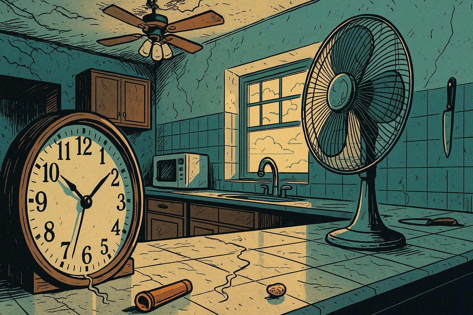 I don’t remember standing. Just the fridge’s hum. Air, suddenly too thin. My fingers curled against the counter. The knife drying by the sink. The clock stuck at 2:57.