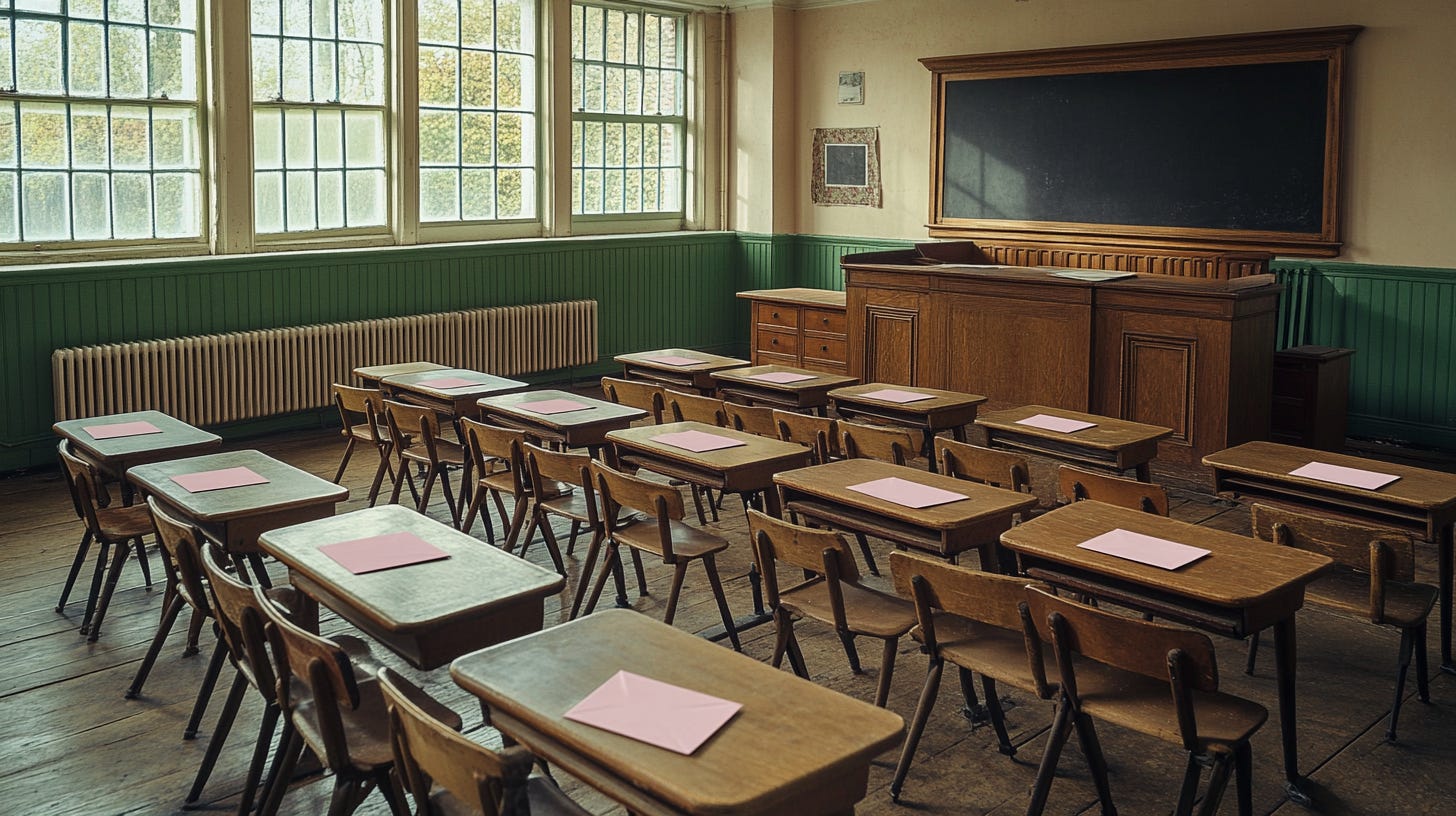 We filed into Mr. Wright’s classroom after lunch. The desks had been rearranged. On each: a pink envelope, too neat to be ignored.