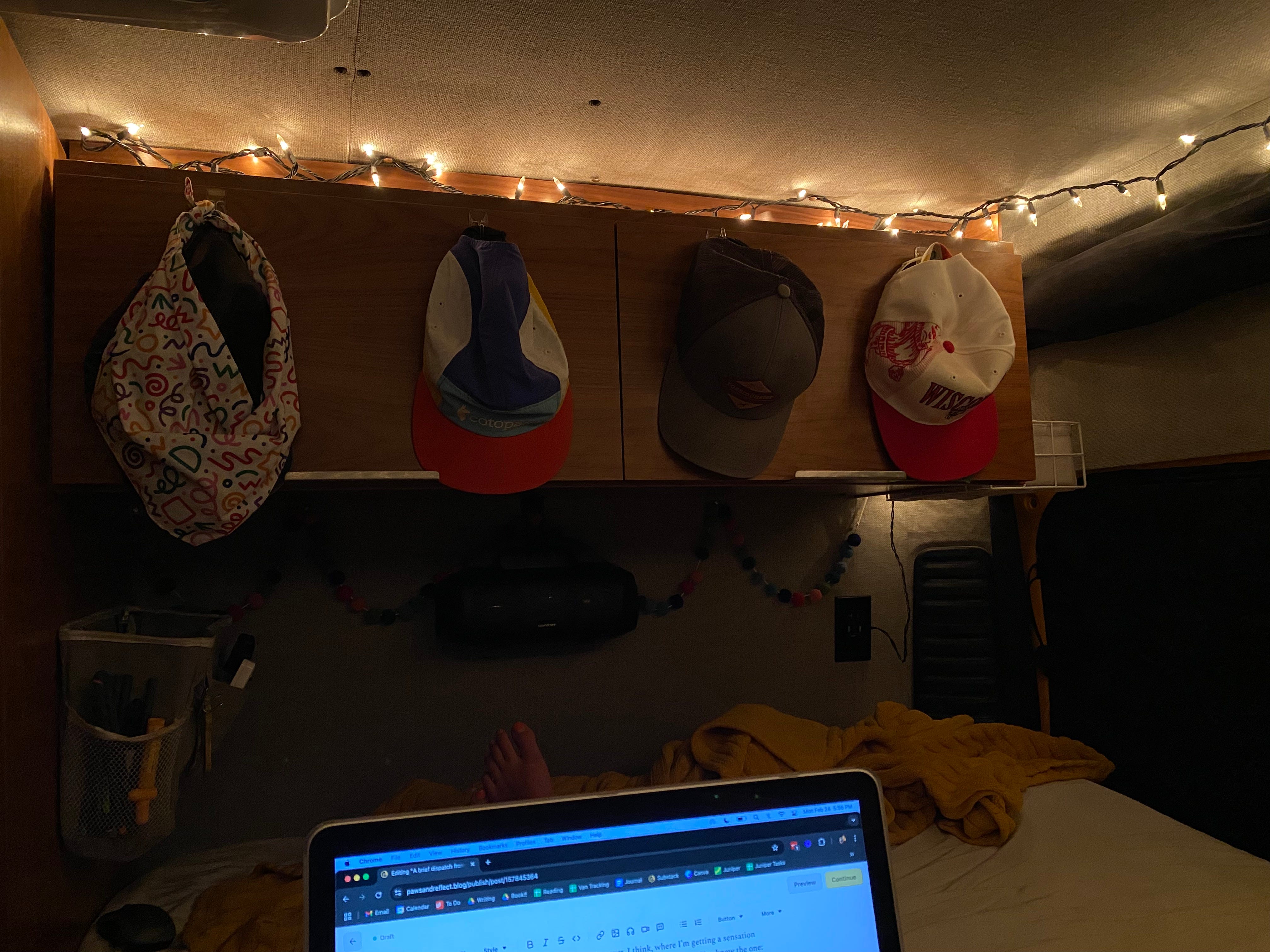 I inhale. I look at Scout sprawled on the bed next to me. We are not in paradise—we are in yet another parking lot, the same sort of environment we’ve spent a fourth of our nights in since moving into the van—but 1) we are undisputedly allowed to sleep in our vehicle here and 2) there is literally nothing to do outside. I feel complete security in my home coupled with complete lack FOMO.