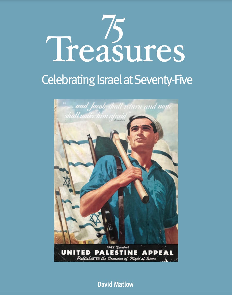 Today, Israel from the Inside is affording you a brief “private tour” of David Matlow’s one-of-a-kind Zionist museum. Our tour guide is David Matlow himself. David recently created a book called “75 Treasures: Celebrating Israel at Seventy-Five”, which he has generously made available for free download here. Through these 75 artifacts, David tells the story of Israel creation and the Jewish people’s rebirth.