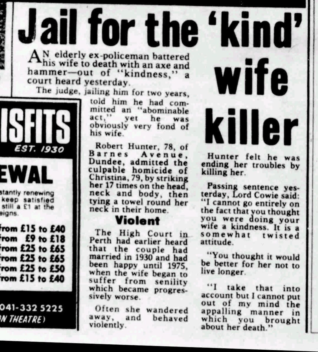 In January 1980 a 79 year old woman called Christina Hunter died in Dundee. Her husband - a retired police officer - had subjected her to a dreadful, sustained violent assault. She had been married to her husband for 40 years, had grown up children with him, but had been suffering from ‘senility’ (what we’d probably now call dementia) for several years. Her husband Robert had been caring for her - he’d ‘had to take over the complete running of the house’. Press reported that Christina had been wandering from their old folks flat, that her behaviour had become ‘challenging’ or ‘aggressive’, and that Robert Hunter had been told it was time for his wife to go into a care home.