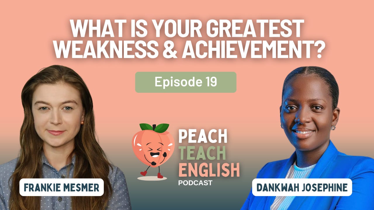 In this episode of the Peach Teach English Podcast, we explore how to answer two of the most common job interview questions in English:✅ “What is your greatest weakness?”✅ “What is your greatest achievement?”