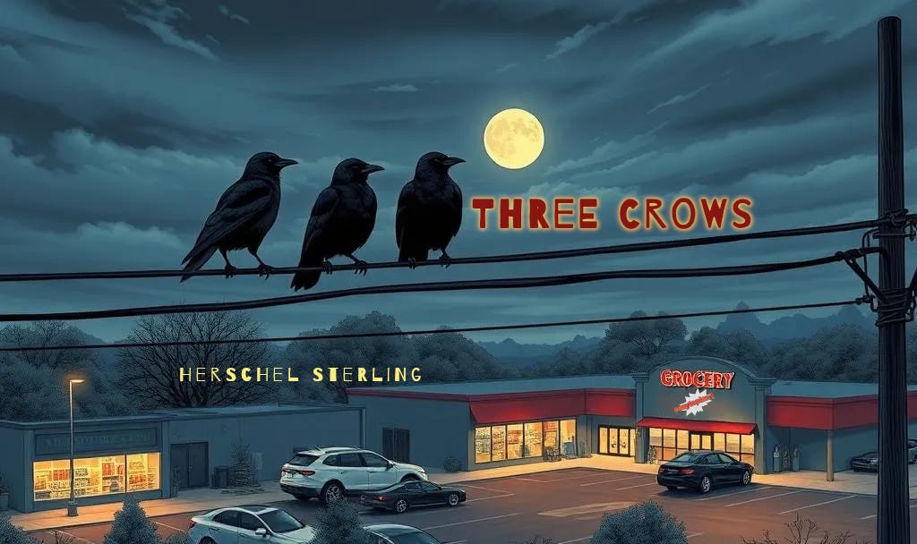 Three crows are chatting on an electric line overlooking a parking lot at a declining family owned grocery store.