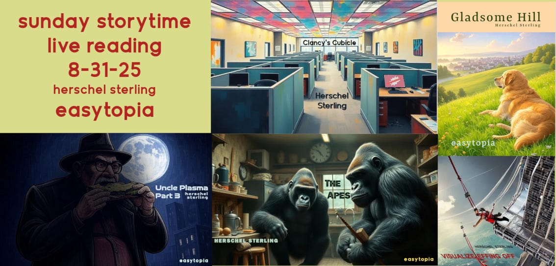 Here are five Stories from a live Discord reading from Sunday, Aug. 31. Clancy’s Cubicle, Uncle Plasma Part 3: The Ride, Gladsome Hill, The Apes, and Visualize Effing Off. Join my Discord channel and read your stories, or just share your passion for storytelling and reading. https://discord.gg/eQ9HKzgvus