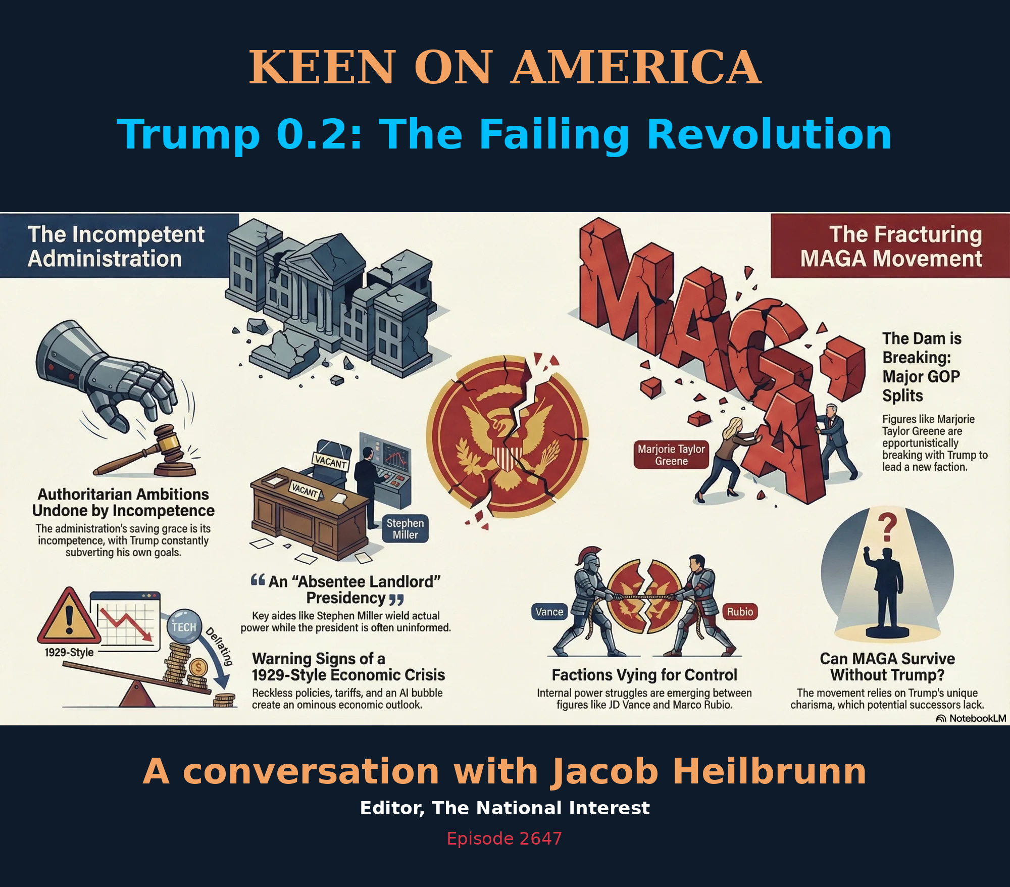 The 2025 Trump was supposed to be a more refined version of the 2017 original. But according to National Interesteditor Jacob Heilbrunn, Trump 2.0 has fizzled into Trump 0.2. 2025 will be remembered, Heilbrunn argues, as the beginning of the end of Trump’s authoritarian aspirations. MAGA has fractured, the administration is incompetent, and Trump himself is running what Heilbrunn calls an "absentee landlord" presidency. And things, Heilbrunn predicts, are only going to get worse. In 2026, he suspects, there will be a serious economic downturn—even an AI-triggered 1929-style crash—that will only formalize the dismal failure of Trump's second regime. Perhaps. Although Trump always seems most resilient after being written off by DC pundits like Heilbrunn. The old pugilist, albeit only a “quasi-Caesar”, still has a few more rounds in him. Three more years, to be exact.
