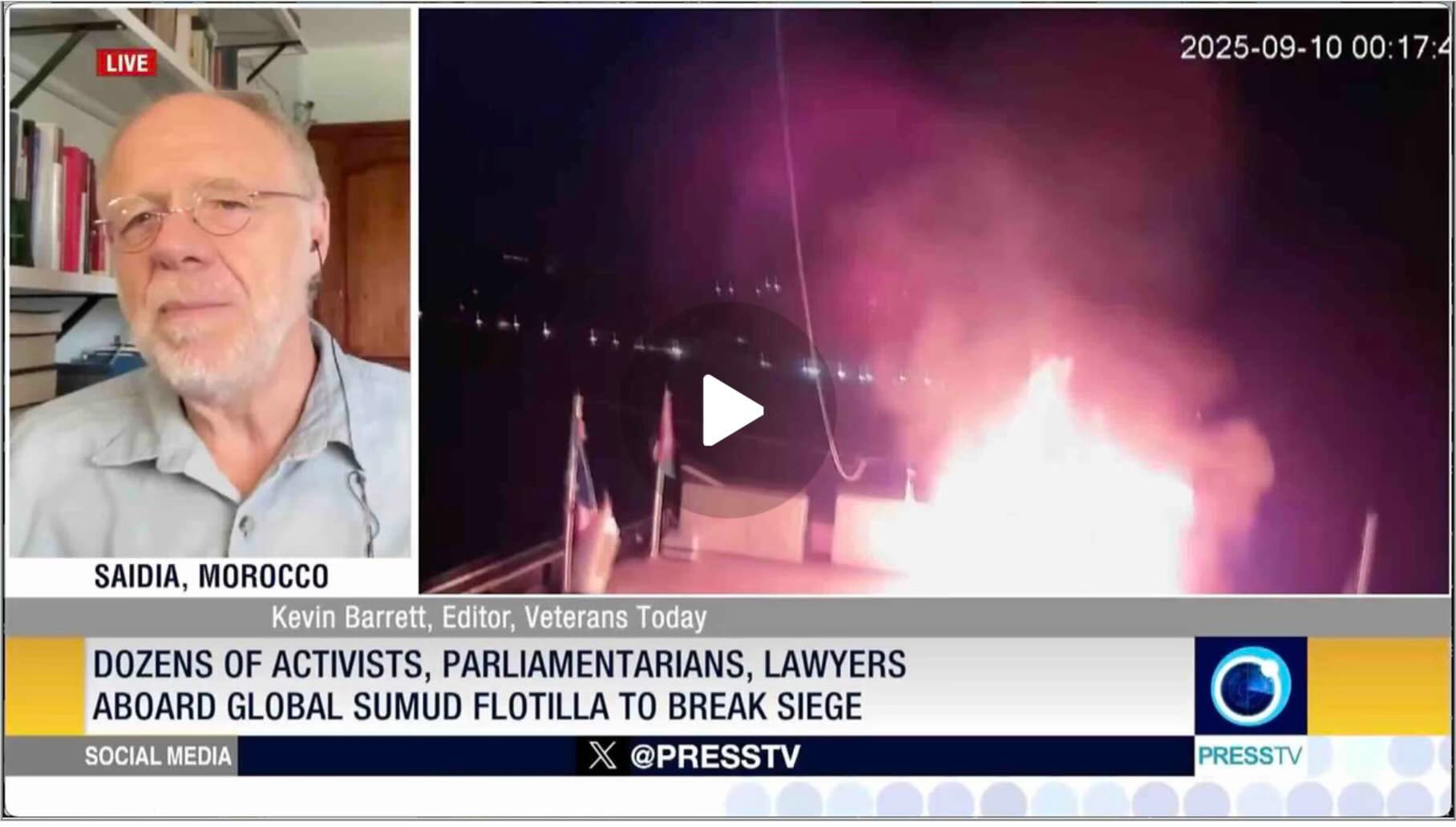 Press TV: And to discuss that topic and more, we are now joined by Booker Ngesa, who is a member of Kenya-Palestine Solidarity Movement, joining us from Nairobi, and also Kevin Barrett, editor of Veteran Today, who is joining us from Saidia, Morocco. Gentlemen, thank you so much and welcome to the program. I’m going to start with Mr. Kevin. This is not the first time that we have seen the Israelis continue to attack this particular flotilla. But in your opinion, with the intervention of the Europeans, do you think we might be heading towards something entirely different?