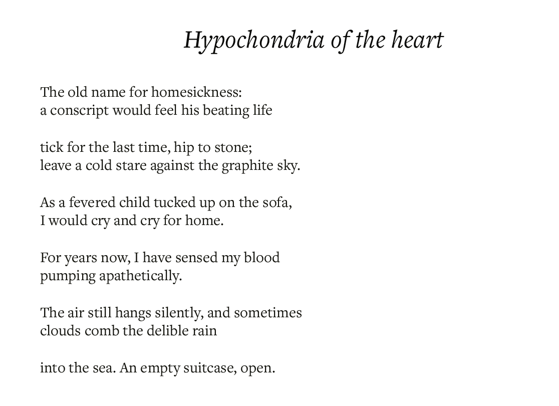 Continuing section IV’s theme of PSYCHOSIS / SURVIVAL / HALLUCINATIONS is Jenny Pagdin with her second poem, Hypochondria of the heart. Here Pagdin extends the theme of suspended unease first struck in Before we got the news. Where the earlier poem holds us in the static crackle before catastrophe, this one turns inward, to a homesickness that cannot be resolved. The old diagnosis becomes a way of naming exile within the body: a conscript’s heartbeat against stone, a child’s fevered cry for home, an adult sensing blood that “pumps apathetically.” Pagdin threads the personal through history and weather, showing how longing and illness blur. The poem closes on an open suitcase, a stark emblem of absence and unfinished departure. Together, her poems inhabit the charged space between dread and survival, the mind and body registering damage before words can.