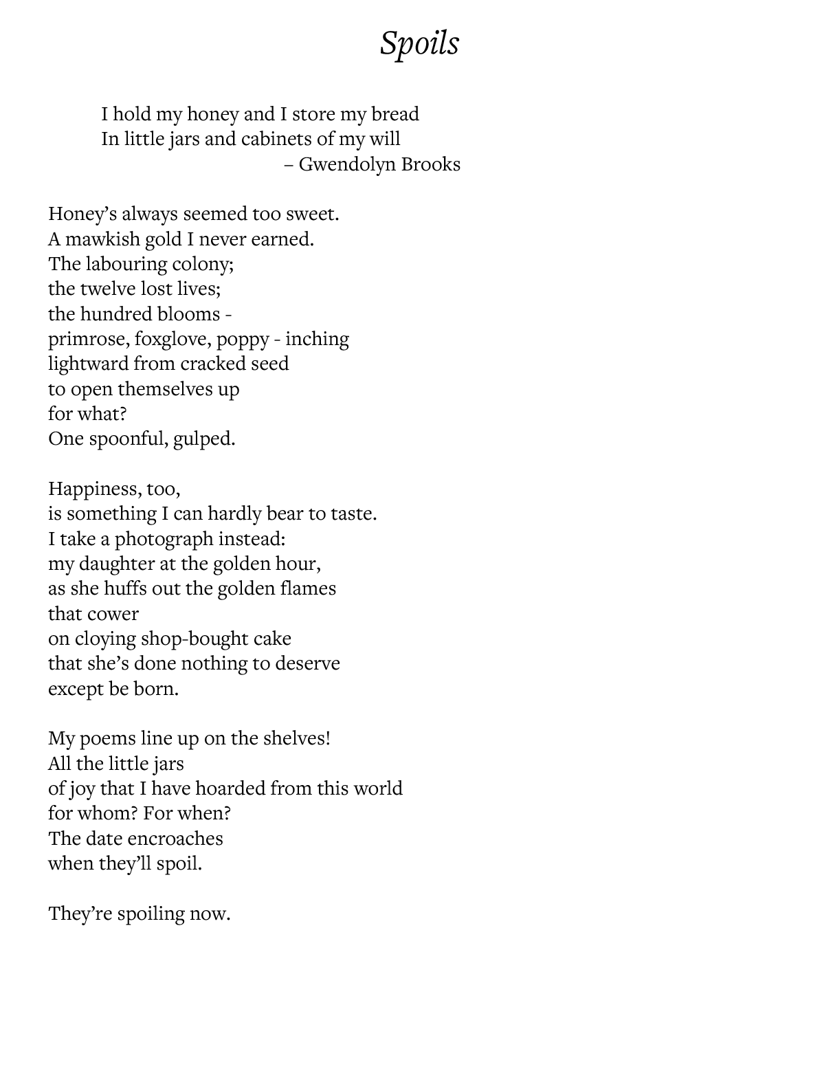 Here, sweetness is labour: the hive, the blooms, the careful work of other lives. And yet it is also something the speaker can hardly bear. Pollard threads that ambivalence through the maternal moment at the poem’s centre, where a child in late-afternoon light extinguishes her candles with the kind of effortless grace adults forget how to believe in. It’s a scene suffused with tenderness, but shadowed by the knowledge that joy doesn’t always arrive in a form we know how to keep.