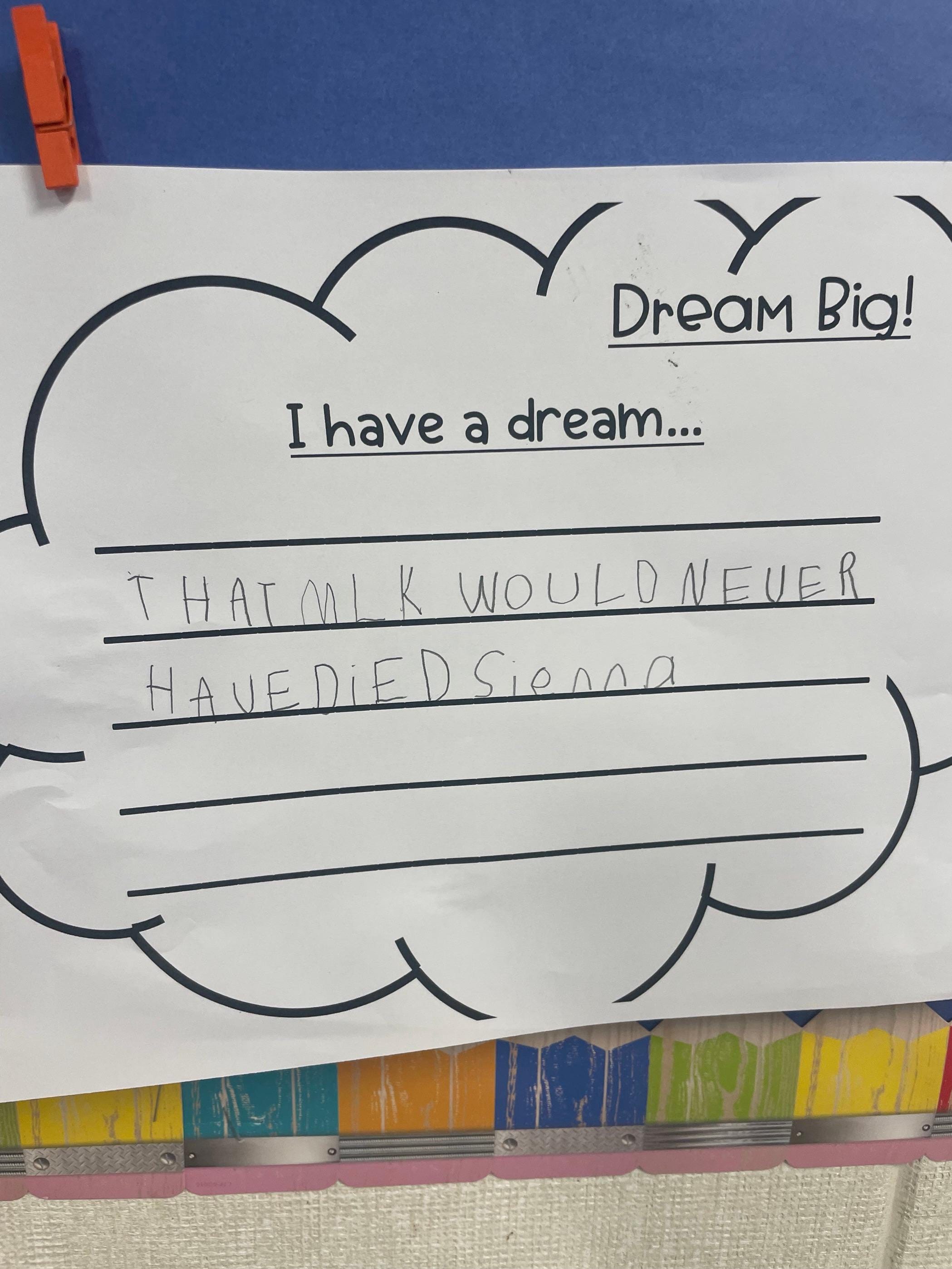 At the end of the school week, they all filled out what their dream was. My daughter wrote on her worksheet, “I have a dream that MLK would never have died”.