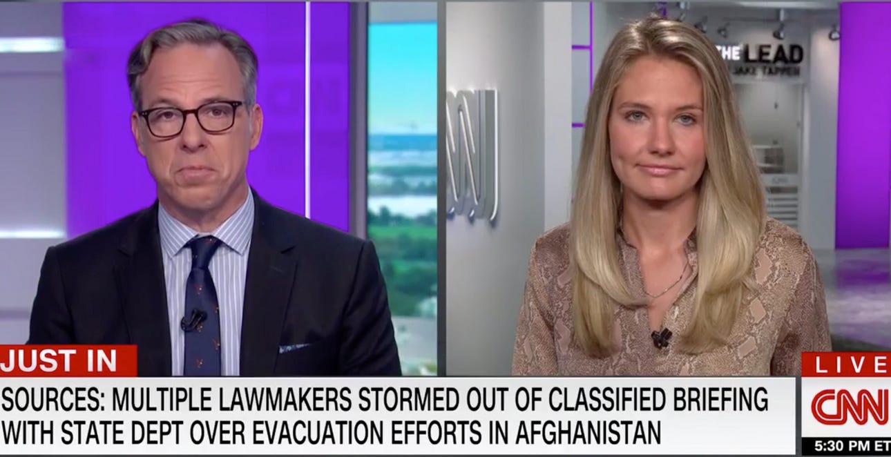Atwood told CNN’s Jake Tapper the same story on Wednesday afternoon: “Lawmakers on both sides of the aisle, we should note, Jake, stormed out of the room because they felt like they weren't getting the detailed information that they needed to really understand what else needs to be done here with regard to the U.S. evacuation efforts from Afghanistan.”