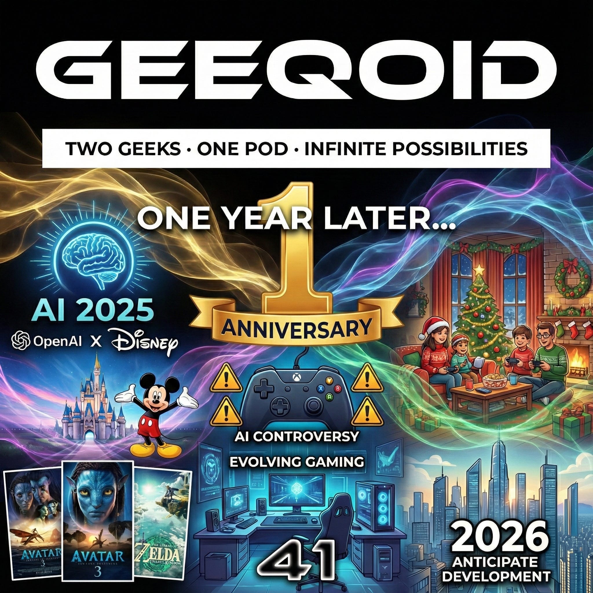 In this episode, Erik Wesslen and Jarrad Shaw celebrate the one-year anniversary of their podcast, discussing significant developments in AI, industry partnerships, and the impact of generative AI on gaming. They also pay tribute to the late Vince Zampella, share their holiday plans, and look ahead to upcoming movies and the year 2026.