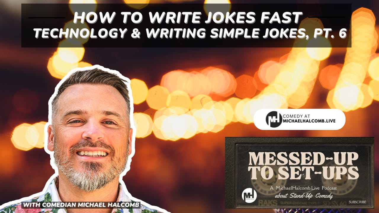 It’s the sixth installment of the “Messed-Up To Set-Ups” podcast and, in this episode, comedian Michael Halcomb spends some more time pulling back the curtain on his joke-writing process. This time he talks about how to write jokes fast and some technology that’ll help you do so. To watch this episode on YouTube, which is probably more helpful since you can see the process in action, go HERE. Watch earlier episodes about writing jokes from news headlines HERE. For more great resources, check out MichaelHalcomb.Live.