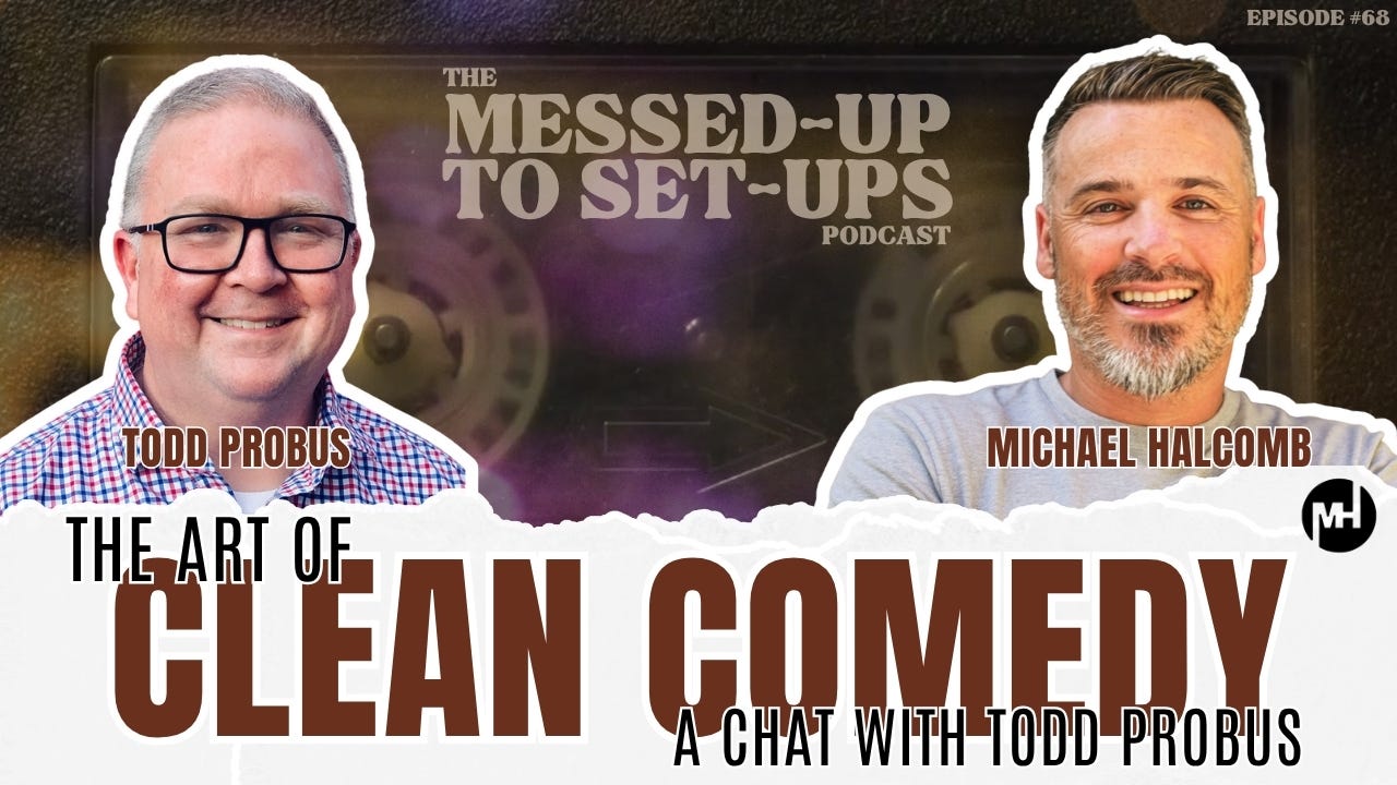 Hi Friends! Episode #68 of the Messed-Up to Set-Ups Podcast is now live. In this episode, I sit down with comedian and pastor Todd Probus. We dive into his fascinating journey of starting stand-up comedy in college, moving to L.A., leaving stand-up, then finding his way back to it later in adulthood. In addition, Todd shares his experiences of performing clean comedy, the challenges of balancing ministry life with stand-up, and the art of clean comedy. But Todd doesn’t just perform, he’s also a comedy producer and gives some insight into what he’s looking for when books comedians. This is a fun conversation filled with lots of insights, tips, and laughter. Tune in!