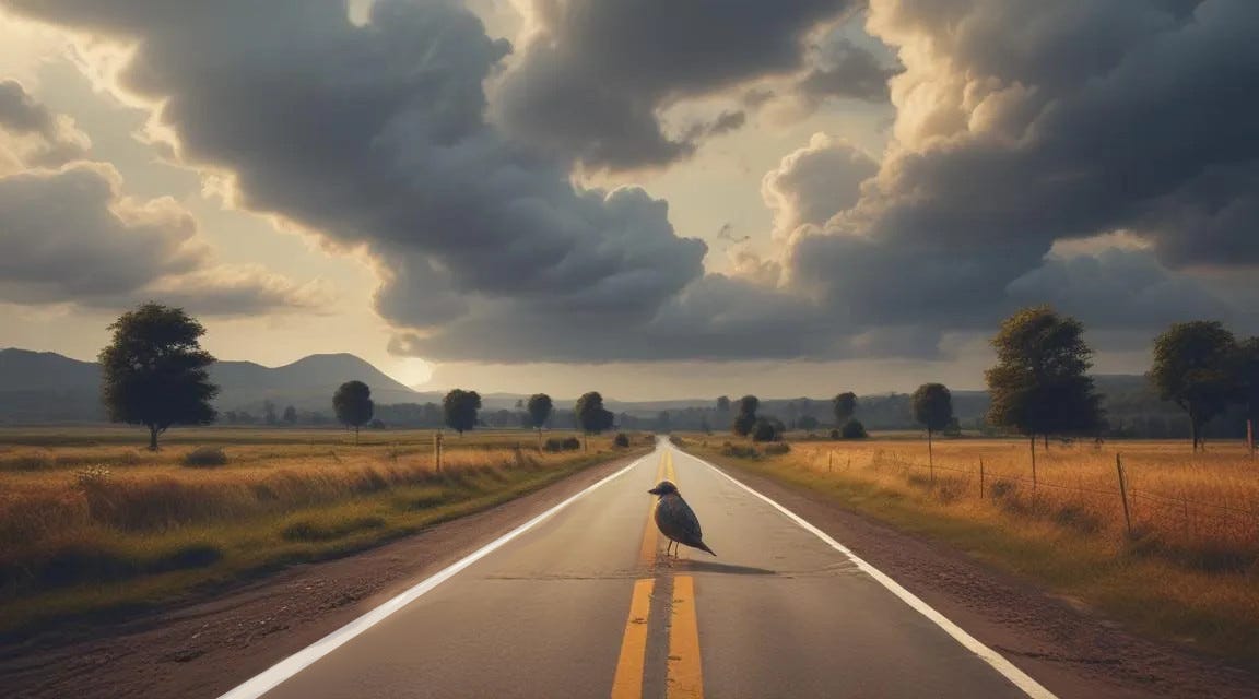 I was driving to work yesterday and I saw a bird in the road. I knew it could fly away and I kept going forward. I felt anxious as I got closer and he still hadn’t moved out of the way, but I kept going forward. I didn’t hit the bird. It flew away so fast I didn’t see it. I kept going forward.