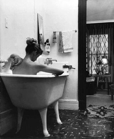 I like how the steam mattes her hair β a casual look that says that she's free. She closes her eyes to draw in that feeling and somehow I feel it too. This is the kind of synergy that well-tuned lovers know well. There'll be a time when her bathing will end and all of these visions will dry up, dress and leave the room β but not now. This is my time, her bath, our pleasure.