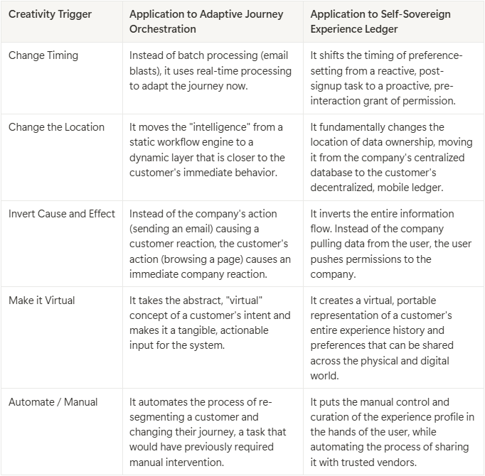 How do we come up with concepts like Adaptive Orchestration or the Experience Ledger? We can use structured creativity frameworks, like the Innovation Matrix, to push our thinking. By applying different "triggers," we can deconstruct a problem and find novel ways to solve it.