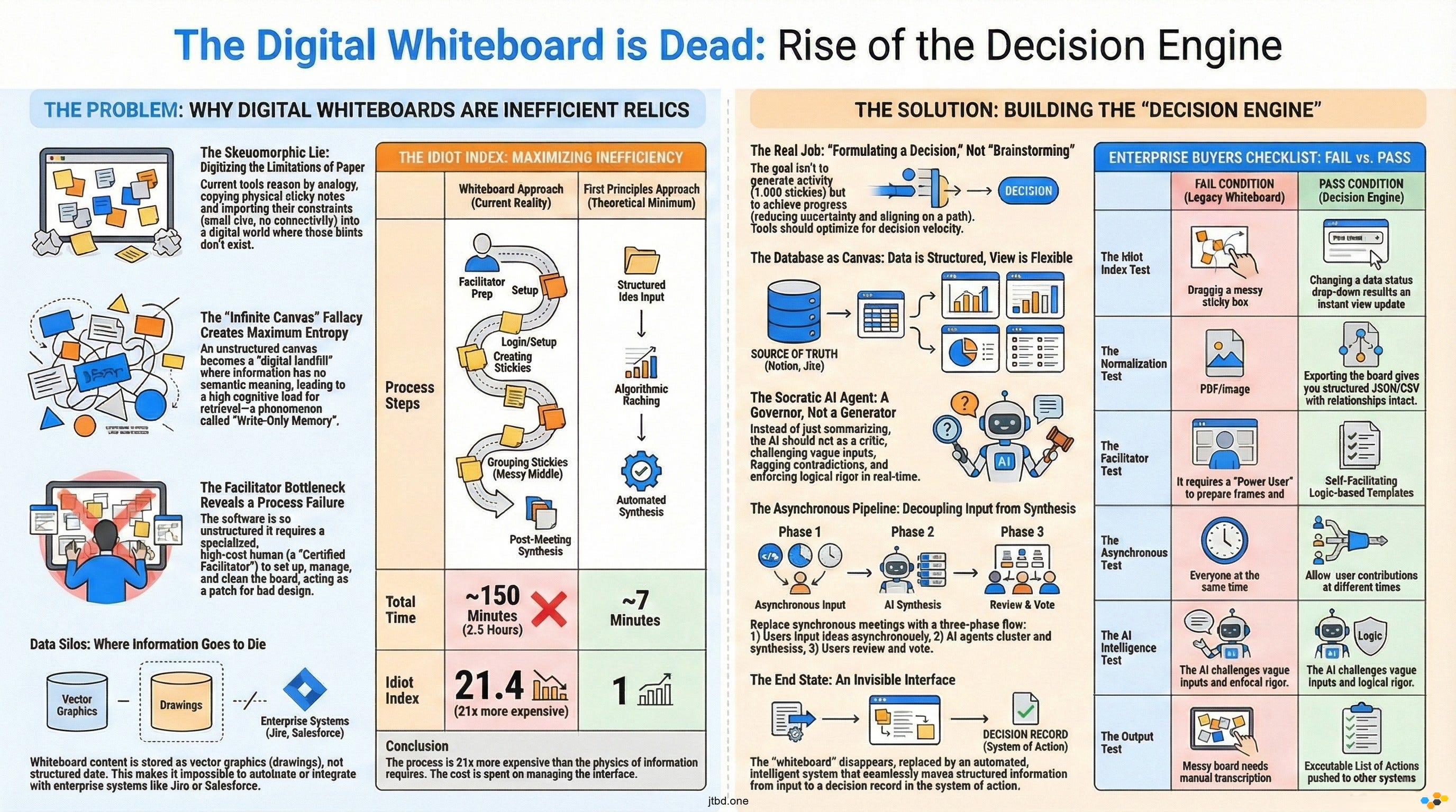 * Application: If a decision takes 2.5 hours via whiteboard but only 7 minutes via structured query, the Idiot Index is ~21.4, indicating massive inefficiency.