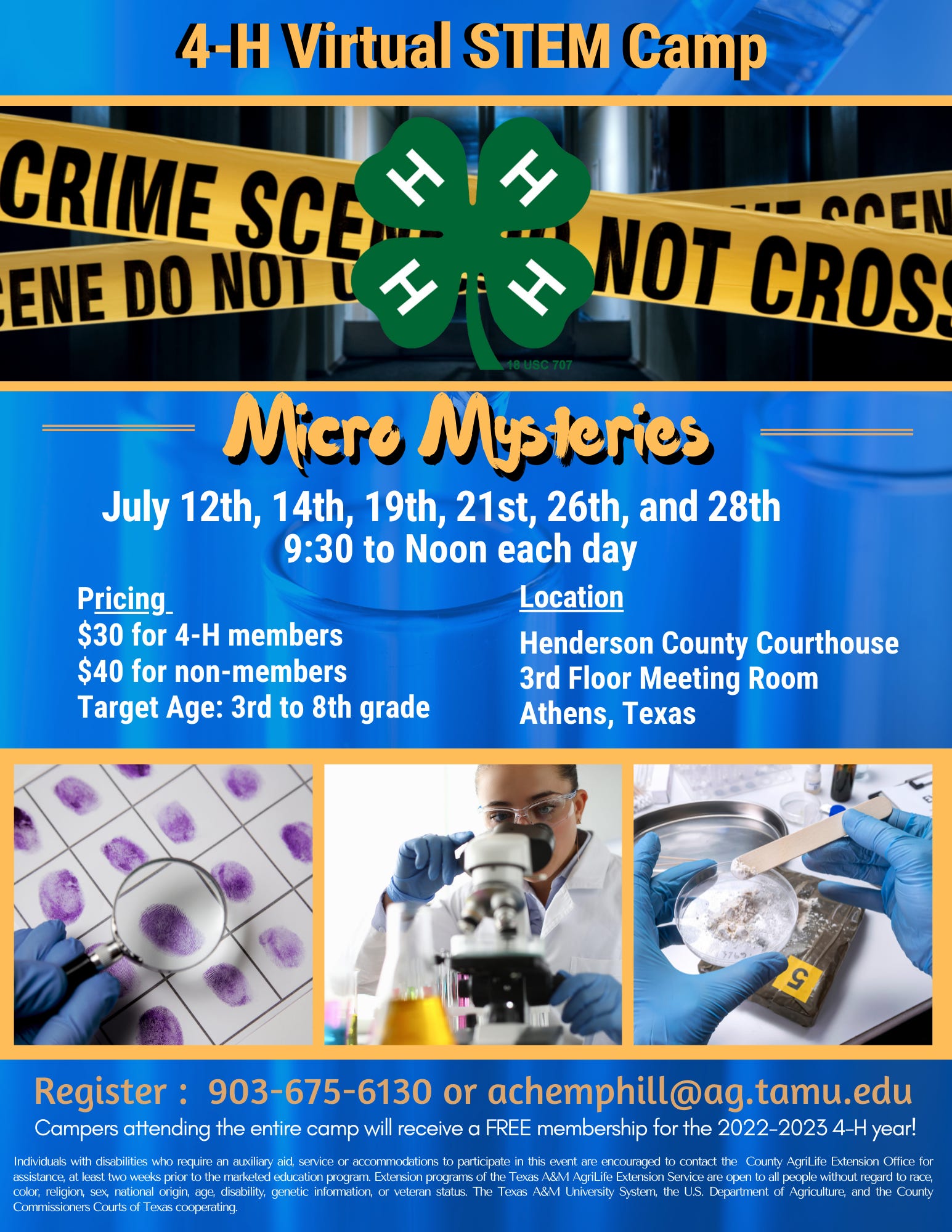 Summary: The 4-H STEM Camp called "Micro Mysteries" begins July 12 and will run every Tuesday and Thursday through the month. The group will meet from 9:30 a.m. to noon at the Henderson County Courthouse meeting room on the third floor. The target age is grades 3 through 8, but high schoolers are welcome. The cost is $30 for 4-H members and $40 for nonmembers.