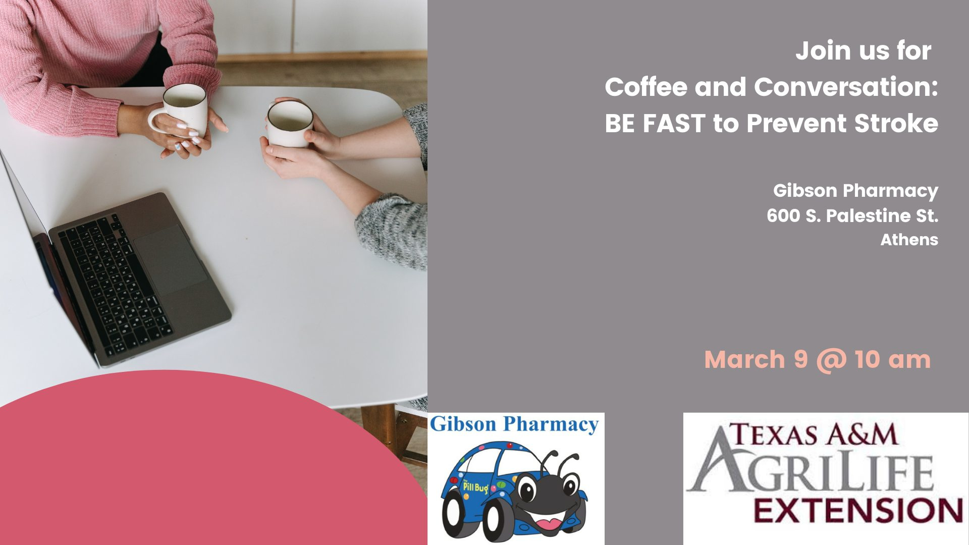 This interview was recorded Tuesday, Feb. 22, at the Henderson County Courthouse. The host is Michael V. Hannigan.==In this week's edition of the Henderson County Texas A&M AgriLife Extension Podcast, AgriLife Agent Carolyn Tyler talks about her upcoming class for spotting the signs of a stroke.This is a Coffee and Conversations event by the AgriLife Extension Service and is a collaboration by the Extension Service and Gibson's Pharmacy. The event will be held 10 a.m. March 9 in the foyer at Gibson Pharmacy in Athens.You will get to network with health experts and other participants while learning important health information in a relaxed atmosphere while having coffee with friends.