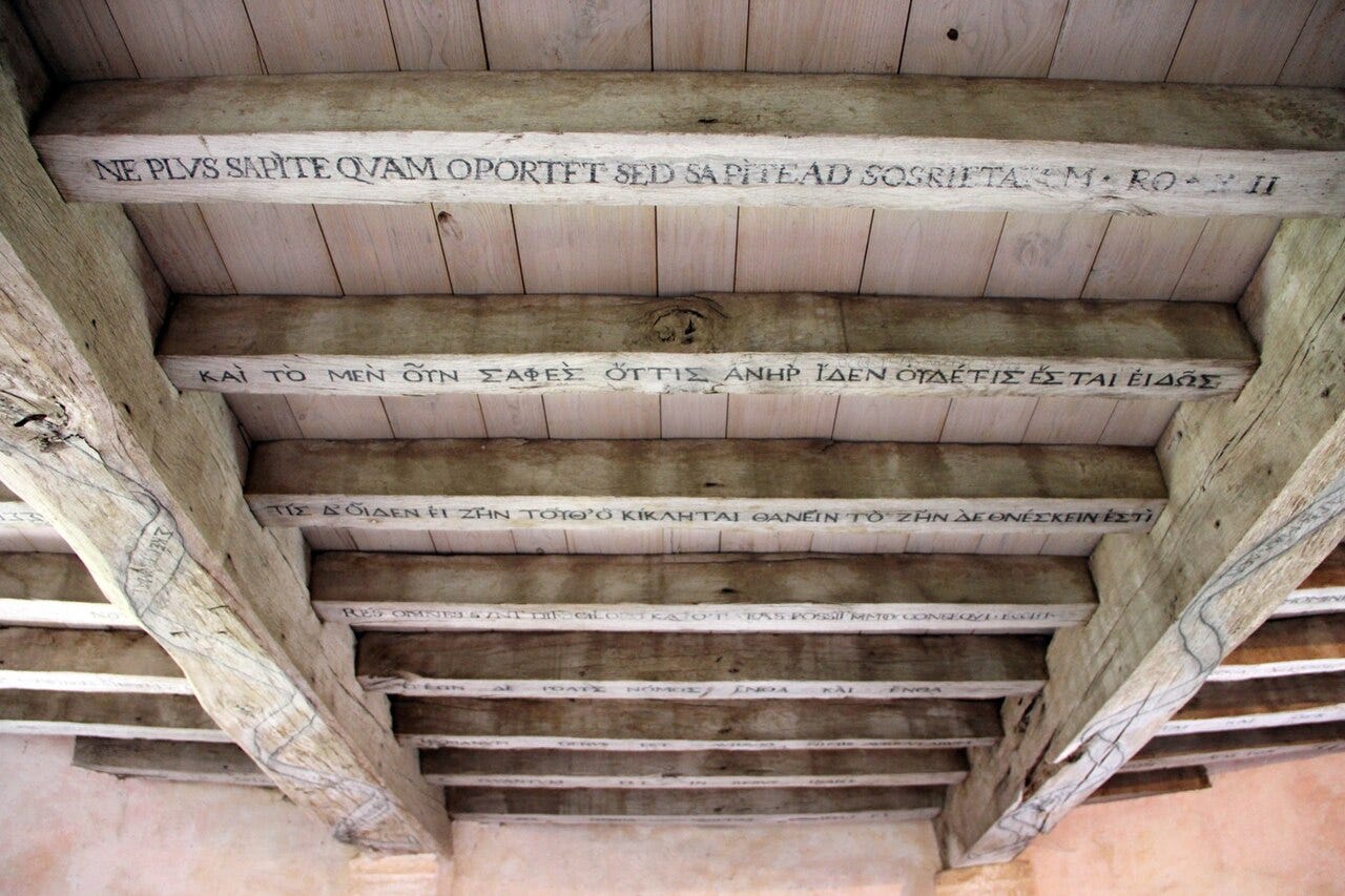 Montaigne grave aussi 57 sentences dans sa bibliothèque, dont 56 issues de l’Antiquité gréco-latine et une seule contemporaine, de Michel de L’Hospital.