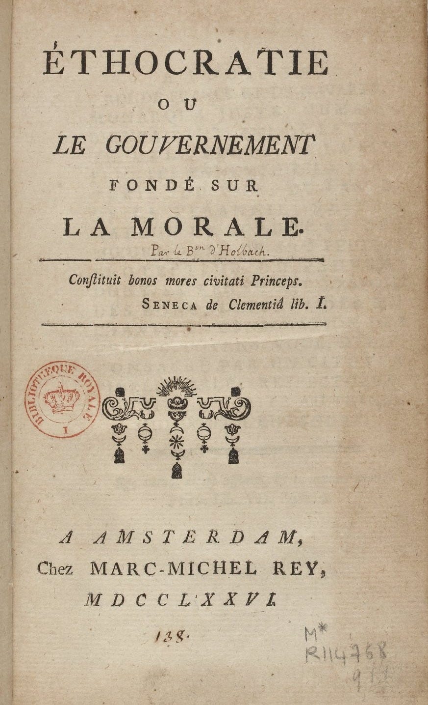 D’Holbach introduit le concept d’éthocratie, formé sur les racines éthique et pouvoir (kratos en grec). Il propose une fusion entre morale et politique, où l’intérêt général guide l’action publique. Cette approche s’oppose au machiavélisme, qui dissocie l’éthique des stratégies de pouvoir.