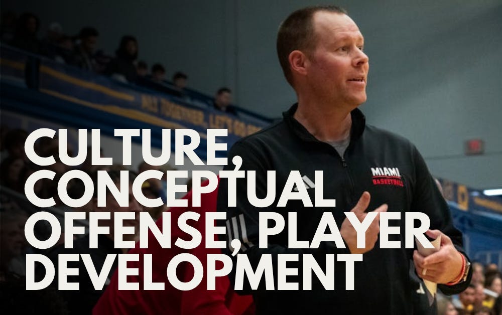 Miami (OH) Redhawks’ head men’s basketball coach, Travis Steele, talks the importance of core values, giving freedom in learning conceptual offense, teaching shot selection, the formula for effective player development.