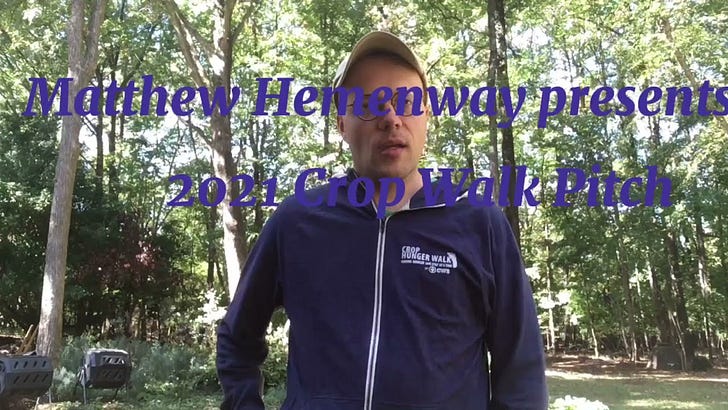 Hey everyone, Matthew Hemenway here. I have been involved with Crop Walk for 3 decades. I have been involved with it since 1990. I have been raising money for Crop Walk for a long time. The Walk will take place on November 7, 2021, in Charlotte, NC. I took a break from it because I needed to recharge my batteries because of trying to recruit. I still gave to it for the 2 years I did not raise any money which was in 2012 and 2013. I believe it to be a worthy cause, and I know in my heart that it is worth doing. Most of us would not know what it would be like to grow up without enough money to buy the food, water, clothes, and even shelter we need, but unfortunately there are those who do. Crop Walk means you walk a certain distance. I believe now it is between 3 and 4 miles. Last year, I did my walk on the Greenway and this year I will do the same because of COVID-19. If you would like to help, please consider giving whatever you can. Please be generous because you can give $5.00 does not mean you should. Please consider giving $50, $100, $500 or a $1,000 if you can. You can always choose the amount you plan to give. If you donate, thank you. Please share this video with your friends and family so that Crop Walk can be as successful as it can. I will leave a link to a page you can donate at the bottom of this video. I will also have you watch a video produced by Crop Walk to see what they do and why it is important to help this worthy cause. Thank you and have a wonderful day.