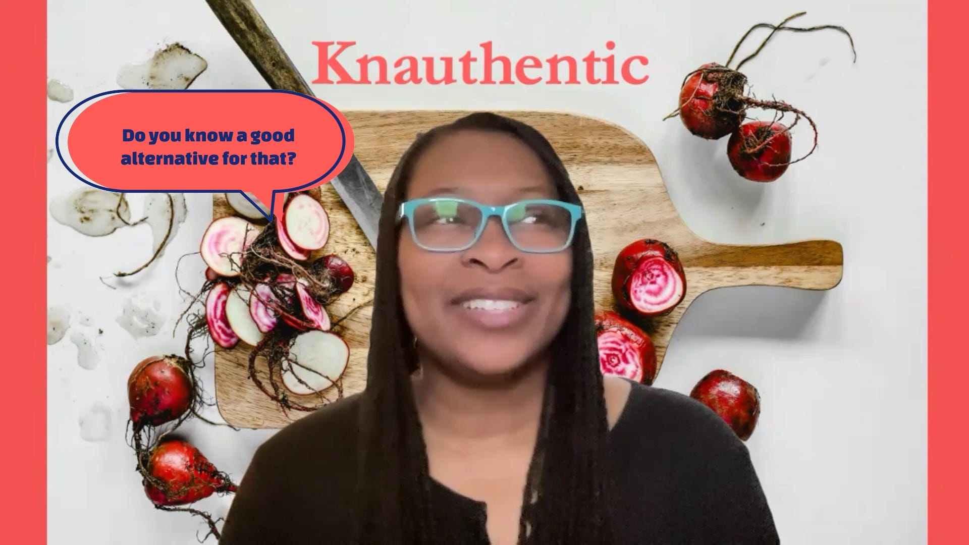 So, now back to alternatives. So, a lot of the content of my book focuses on what my health issues really like, what they are like, why I have these issues and why my diet is so affected by these issues, and how I’m choosing to use my diet to help with some of my issues. And so, with that, I talk a lot about like alternative ingredients because of all of the things that I can eat. And I’m not going to go through the whole rigmarole now, but I’m just going to mention a few things. So, for those of you who are maybe not listening, you are watching on like YouTube or maybe you’re on Substack; the logo that I’m currently using is, you know, not authentic is the word, but there’s a picture of like a cutting board. And I’ve got some beets on the table and I’m that is when I came across that image, it just, like struck me in the head, like I really felt like I’d been hit, but in, like, a good way. when I first started this journey, I really wasn’t trying to come up with, alternatives for, like, everything. I just needed something to kind of get me by. I was just tired of eating, like rice and toast, and, I was losing weight, but not in a good way. Like it was- it was not, like, healthy. It was. I don’t really know how to describe it right now, but one of the things that, when I first learned about all of the stuff I have going on and figuring out what I couldn’t eat was, I couldn’t eat tomatoes, which for me was devastating.