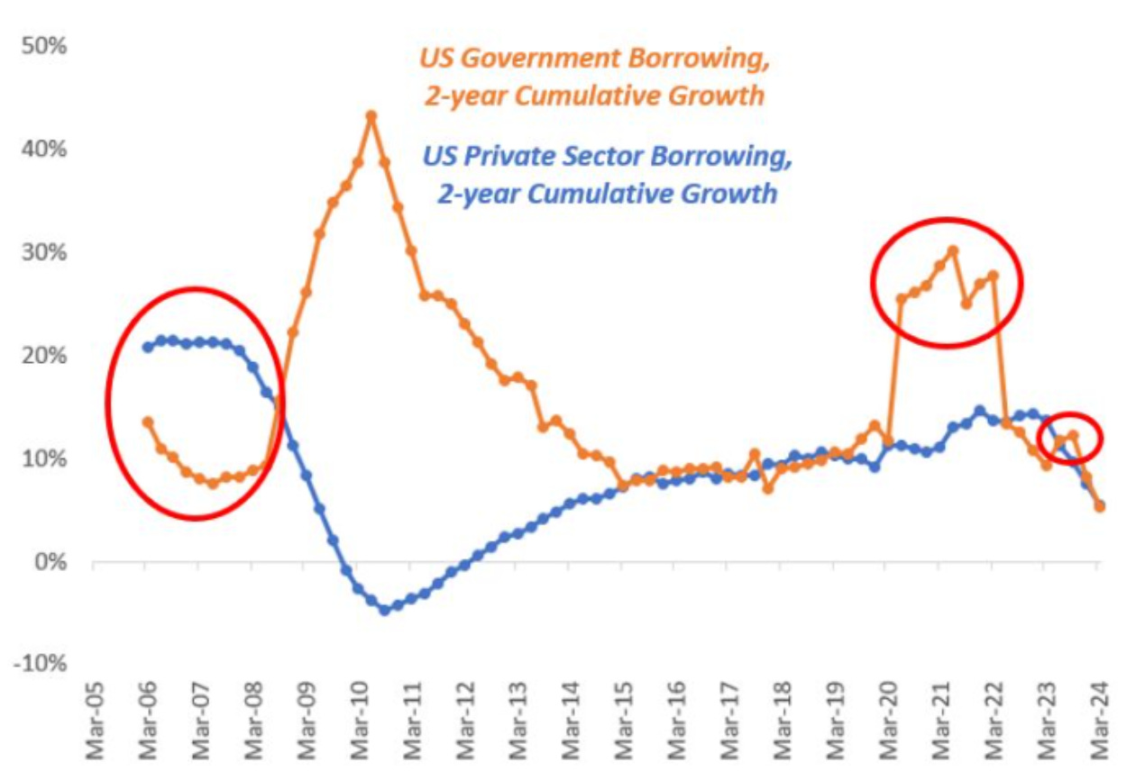 Back then the housing market cracked under the pressure of excessive private sector leverage and the Great Financial Crisis ensued.Today, the story is different: the scale of government deficits (orange) is enormous, but private sector credit (blue) is not roaring.