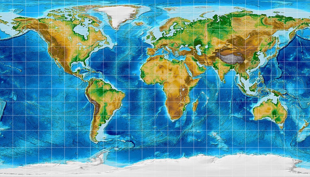 [Image: Topographic world map, projected to Patterson Cylindrical Projection, by Tobias Jung CC BY-SA 4.0, via map-projections.net]