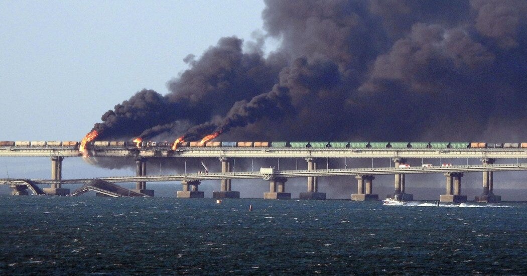 We’ll start this episode with Ukraine’s attack on the only bridge that connects Crimea to Russia, then, we’ll move on to the following: