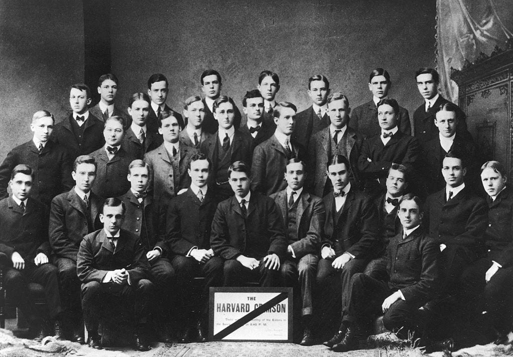This is a job Franklin D. Roosevelt held some 120 years ago. I’ll let you pick him out among all the other suit-wearing, clean-shaven, prep-school-looking WASP-y men in the photo of the Crimson’s staff in those days, above. (He’s near the middle.)