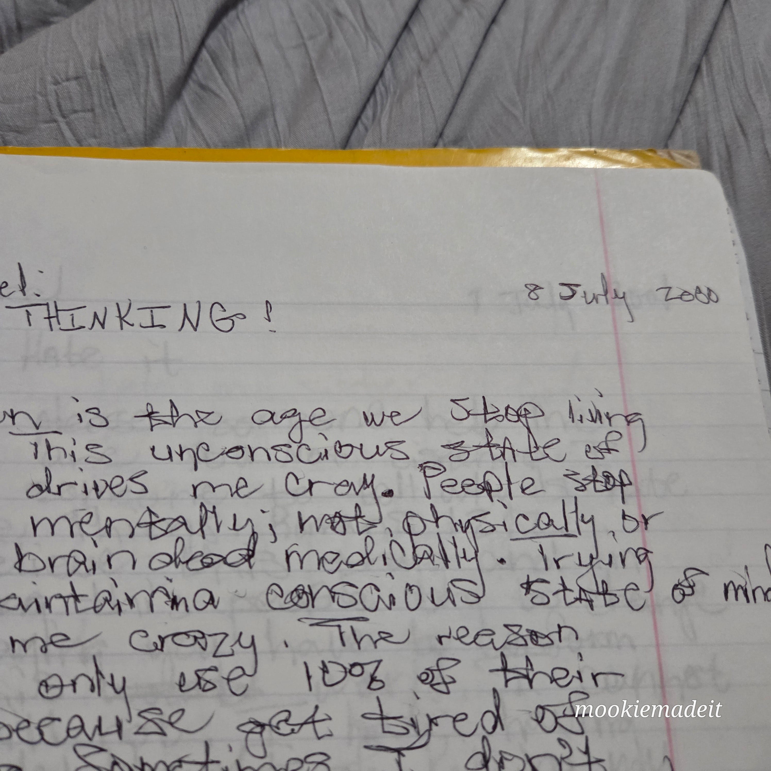 “When is the age we stop living life? This unconscious state of living drives me cray. People stop living mentally; not physically or being brain dead medically. Trying to maintain a conscious state of mind drives me crazy. The reason people only use 10% of their brain is because [they] get tired of thinking. Sometimes I don't feel like I am a part of this world. I try to force people to think by not thinking all the way through myself. Trying to be a humanitarian, I hurt myself by losing my brainpower because I want other people to think. I've thought these same thoughts when I was younger and decided not to spill.